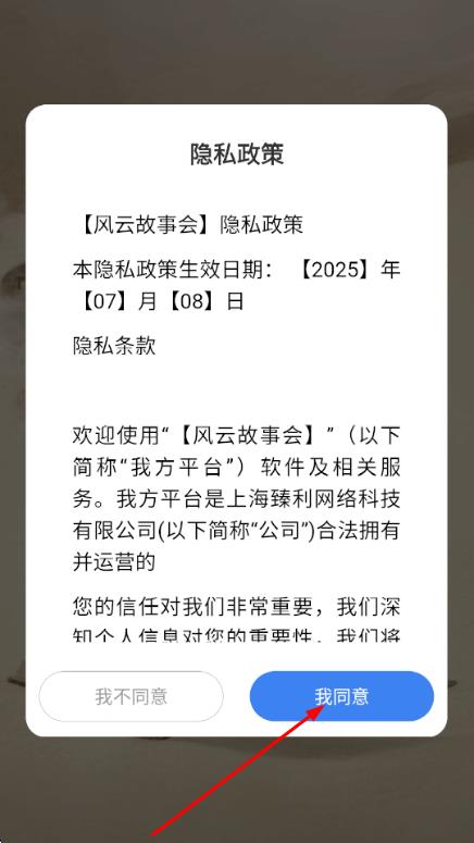 1、使用风云故事会时,首先会弹出隐私政策提示框,点击我同意进入软件。