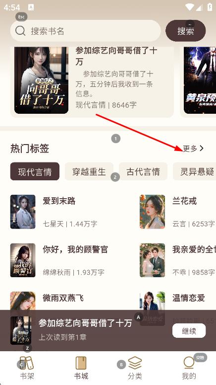 2、在书城页面,若想查看更多标签,点击更多按钮就能浏览更多分类标签。