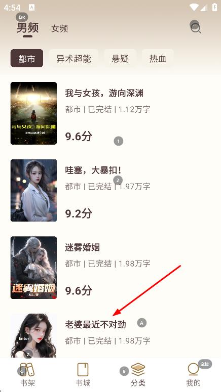 3、在分类页面,选择男频等频道,然后在下方不同分类里挑选想看的小说。