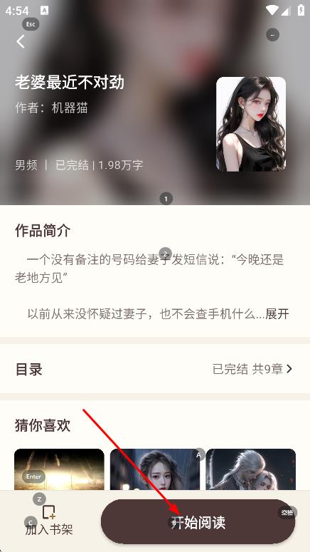 4、进入小说详情页后,点击开始阅读按钮,就可以立即开始阅读该小说了。