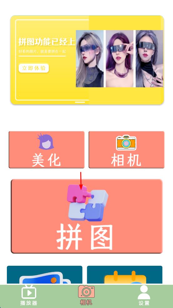 3、在相机功能页面,找到“拼图”按钮,点击该按钮,进入选择图片页面。