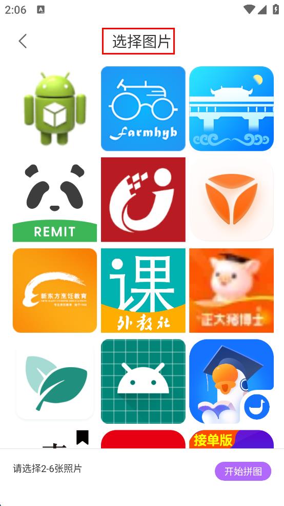 4、在选择图片页面,挑选2 - 6张照片,选好后点击“开始拼图”,即可进行拼图操作。