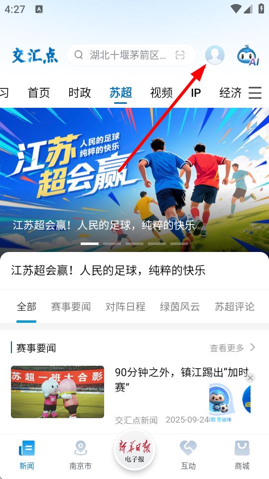 1、在交汇点新闻首页,点击右上角个人图标,进入个人功能页面。