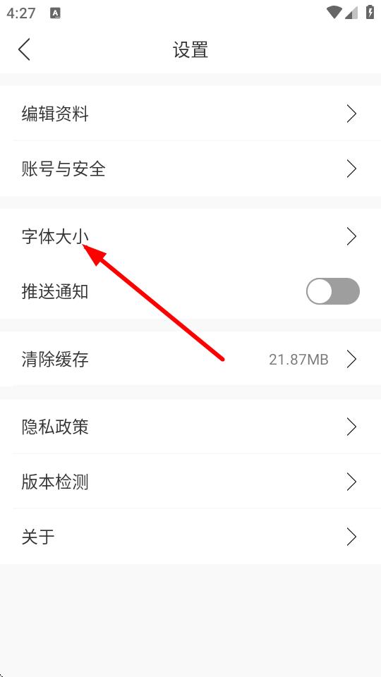 3、在设置的界面,点击字体大小按钮,进入字体设置的页面。