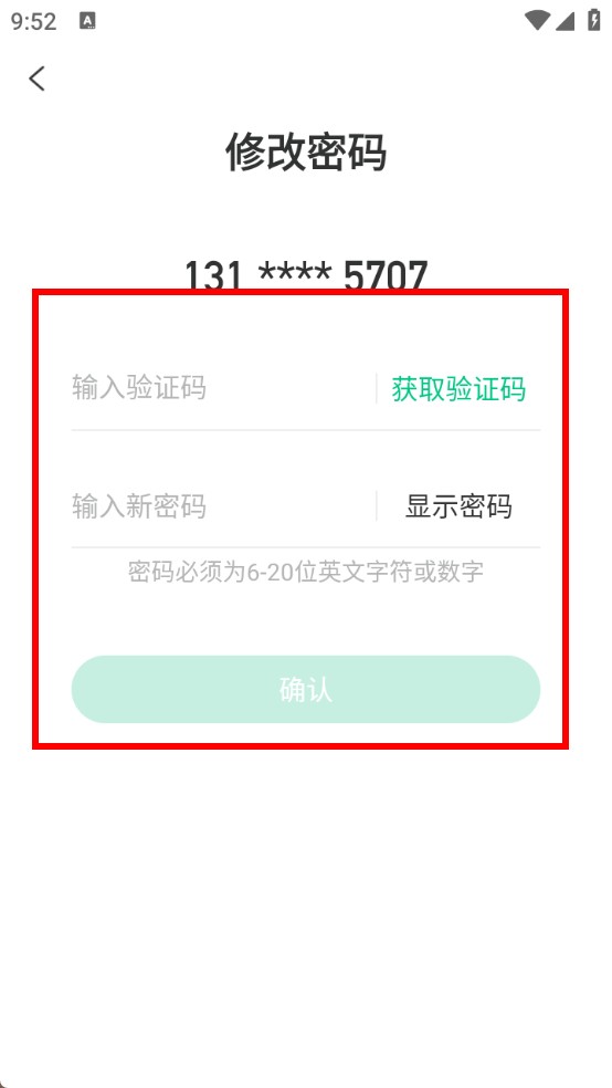 4、在修改密码页面,点击获取验证码,在输入新密码框中设置6-20位英文字符或数字的密码,点击确认,即可设置密码登录。