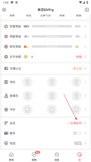 1、打开乐嗨直播APP,进入个人中心,然后点击一元得会员选项。