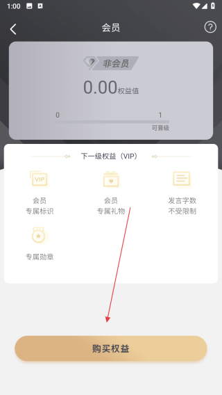 2、进入会员页面后,点击底部的购买权益按钮。