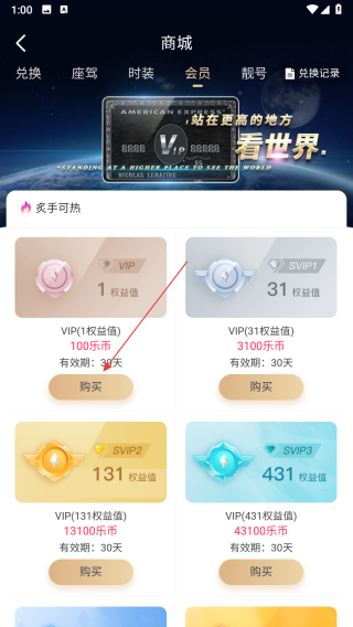 3、在商城的会员tab下,选择要开通的会员类型,点击该会员卡片下方的购买按钮。