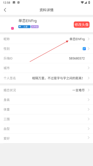 3、在资料详情页面中,找到昵称选项,点击进入昵称编辑页面。