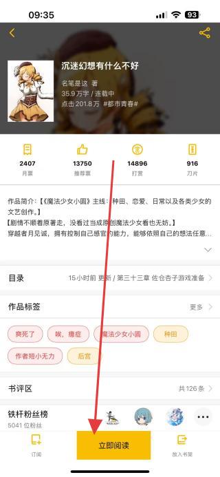 2、点击小说封面进入小说详情页,然后点击立即阅读按钮开始阅读该小说。