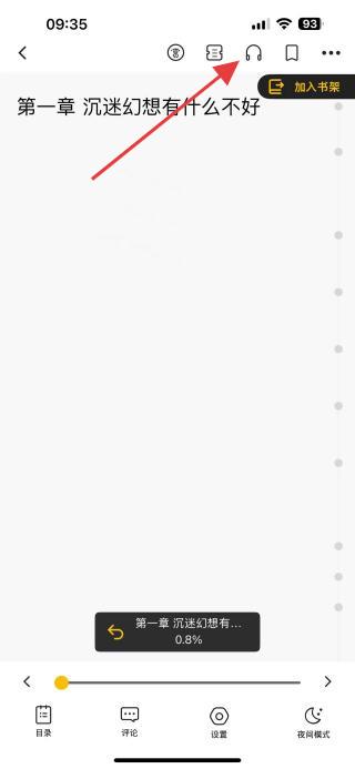 3、在小说阅读界面,点击屏幕中间位置唤出功能菜单,点击上方耳机形状的听书图标,即可开始听书。