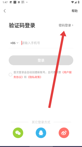 2、在进入到登录页面后,可以点击上方密码登录按钮,切换登录方式。