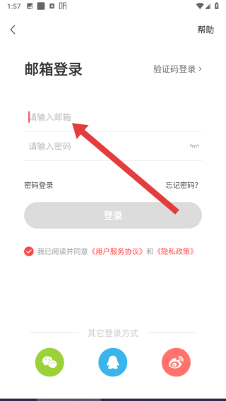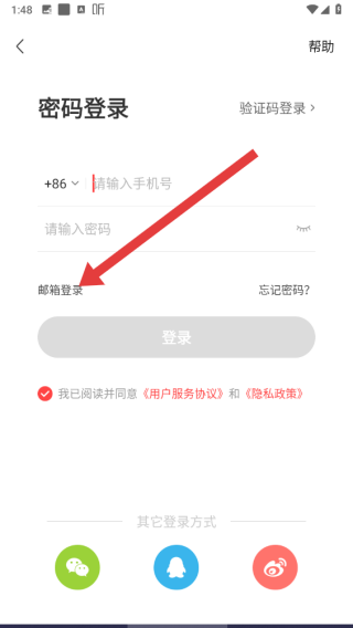 3、在进入到密码登录页面中,还可以点击邮箱登录按钮,切换邮箱登录。
