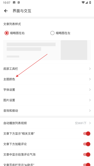 3、进入界面与交互页面后,找到并点击主题颜色选项。