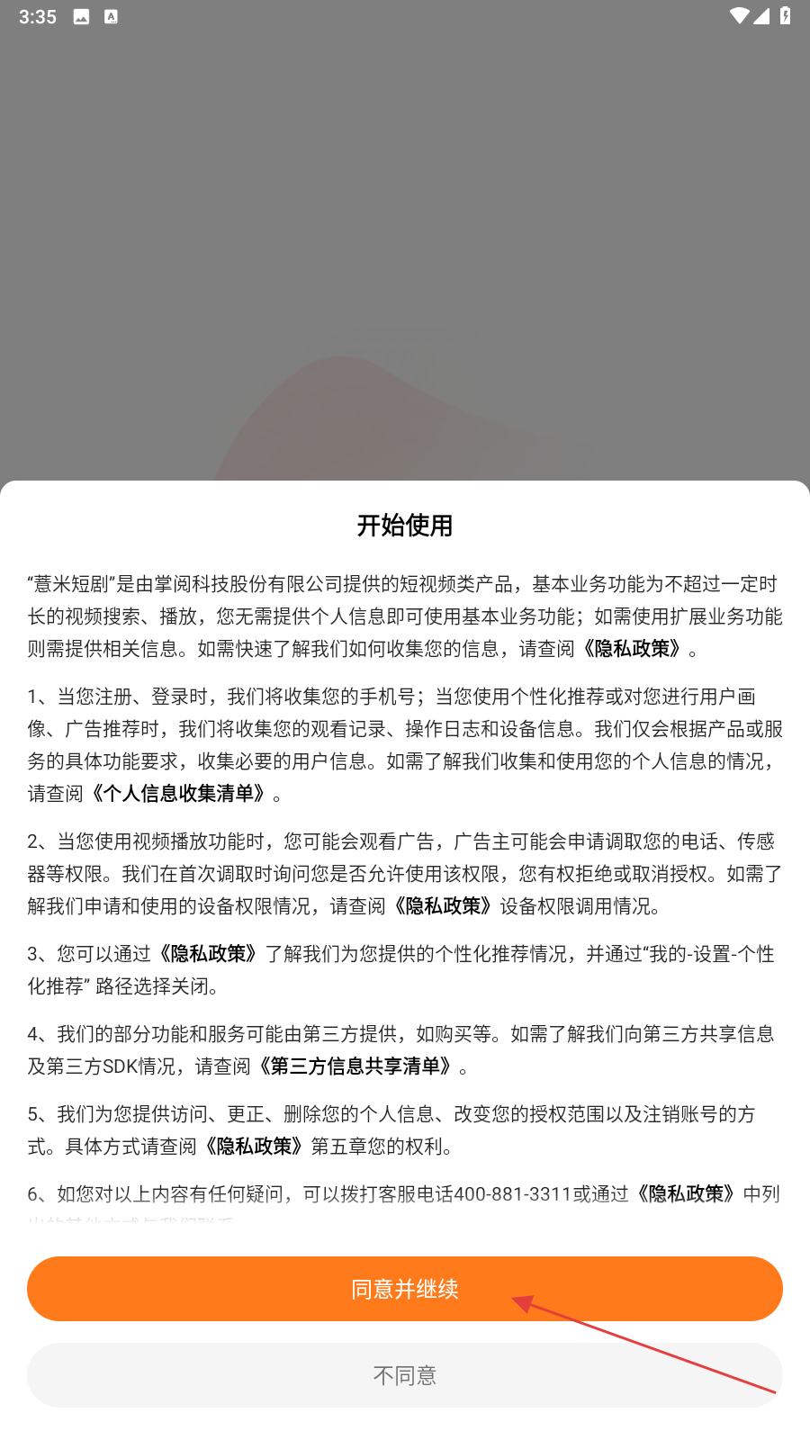 1、打开薏米短剧app,进入时弹出开始使用的内容,点击同意并继续的按钮。