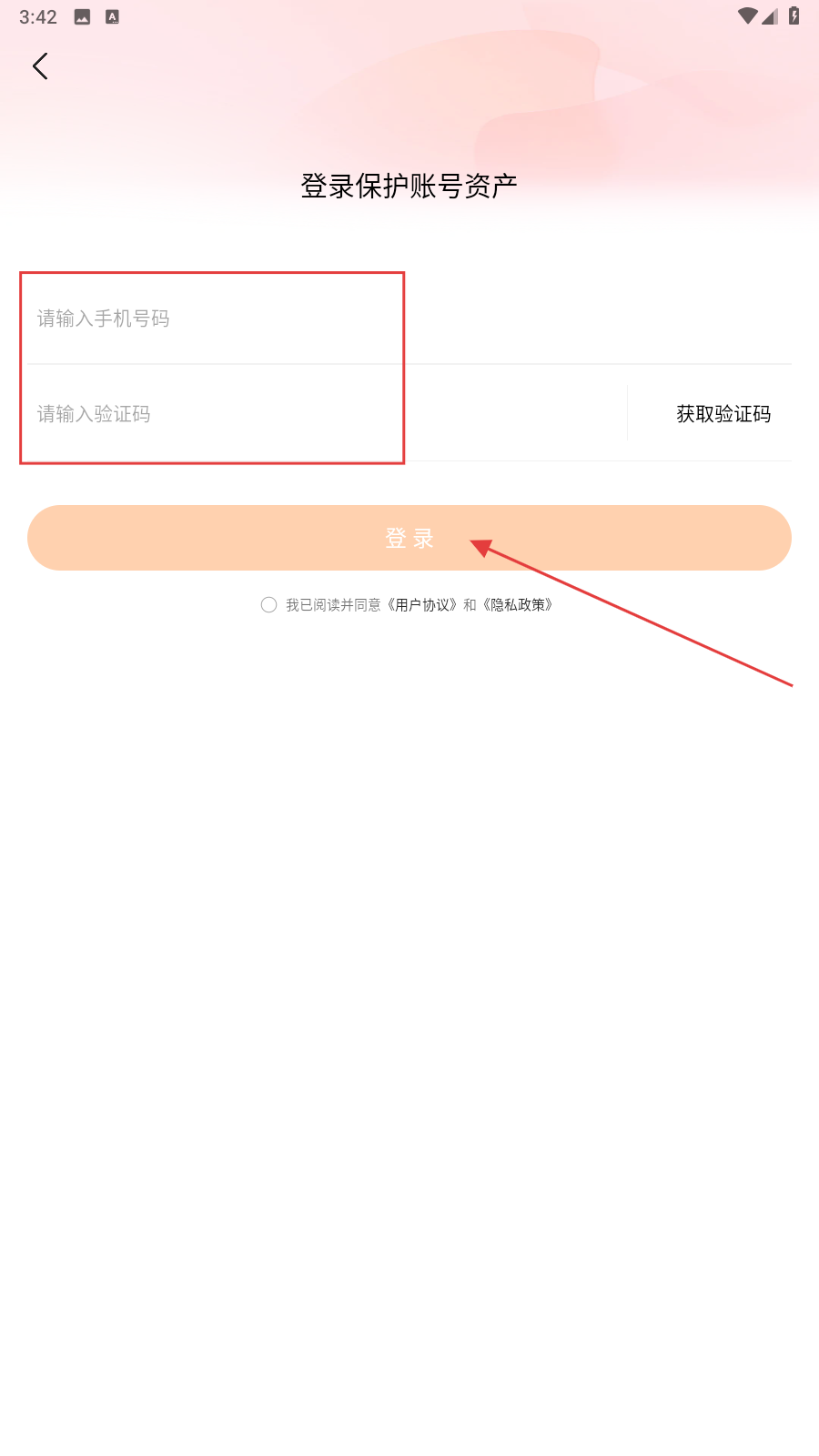4、在登录的页面内,点击要登录的手机号、验证码,再点击登录的按钮即可。
