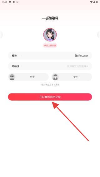 2、登录后,会弹出头像与昵称的设置,用户可任需设置,设置后点击开启我的唱吧之旅即可进入到首页。