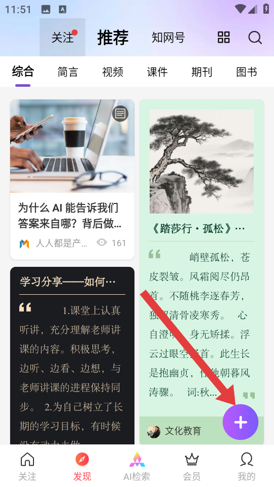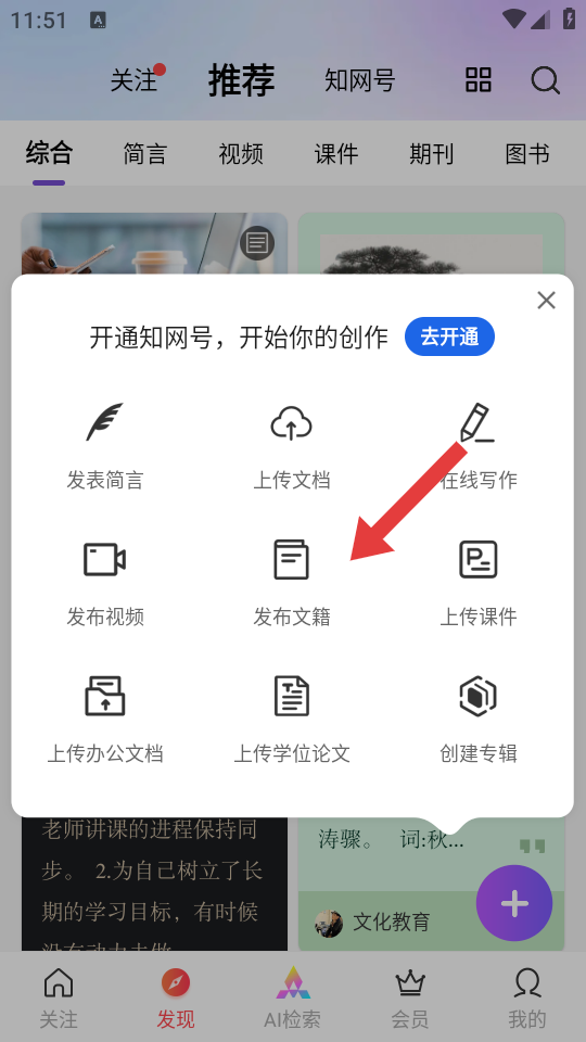 1、打开手机知网APP,进入发现页面,点击右下角紫色+按钮,弹出创作功能菜单。