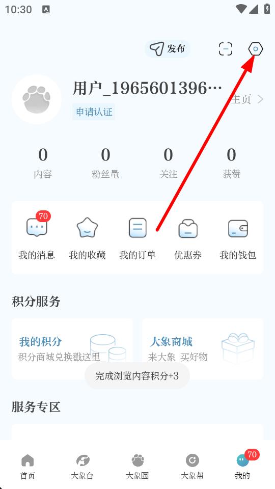1、打开大象新闻App,点击我的进入个人页面,点击右上角设置图标。