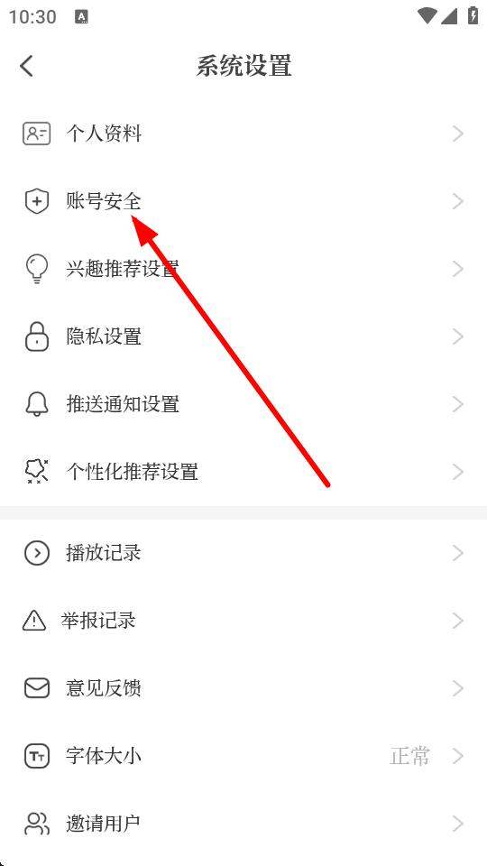 2、在系统设置界面里,点击账号安全选项,进入账号安全设置页。