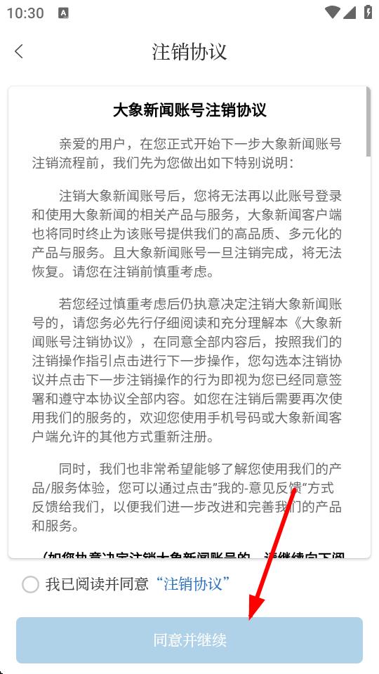 4、仔细阅读大象新闻账号注销协议,勾选我已阅读并同意注销协议,再点击同意并继续,按后续提示完成账号注销。