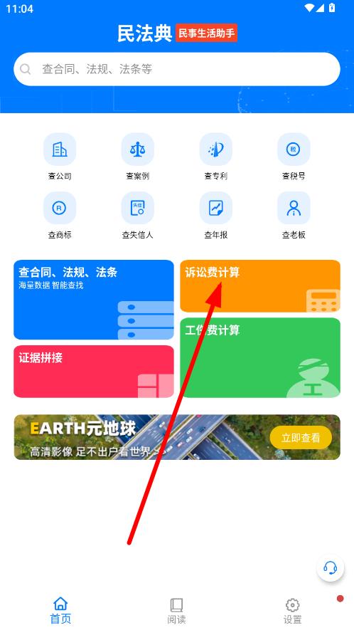 1、打开民法典民事生活助手应用,进入首页后点击诉讼费计算按钮。