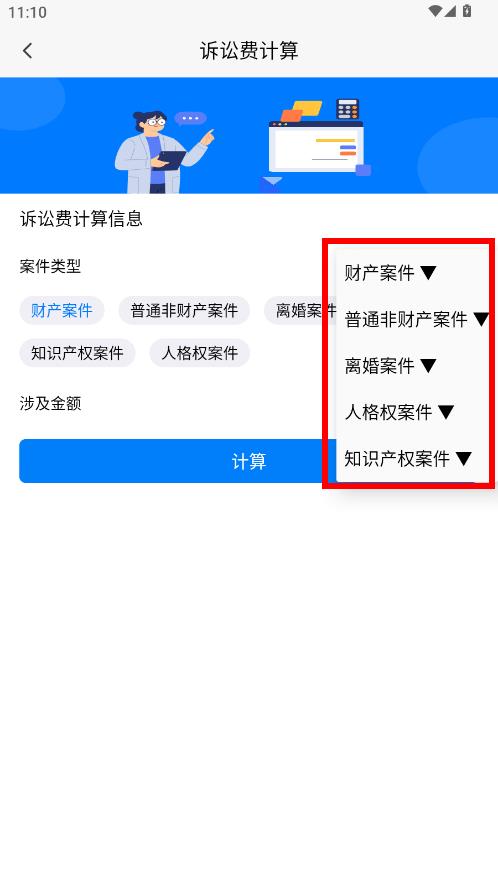 2、在诉讼费计算界面,点击案件类型右侧的下拉箭头,选择具体的案件类型,比如普通非财产案件、离婚案件等。