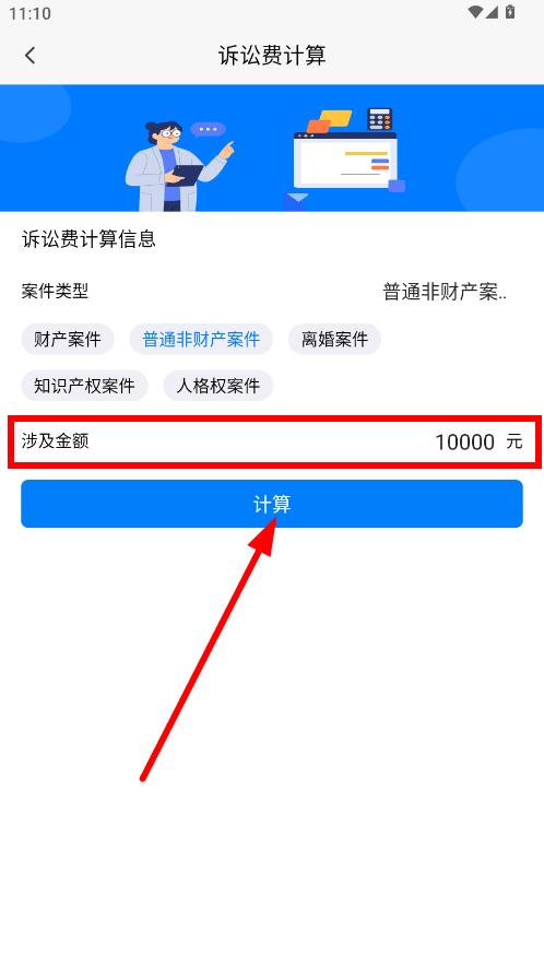 3、根据所选案件类型,在涉及金额处填写对应的涉案金额数值,完成金额填写后,点击计算按钮。