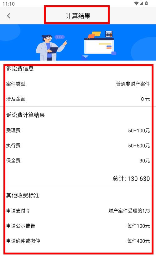 4、随后在计算结果区域,查看详细的诉讼费计算信息。