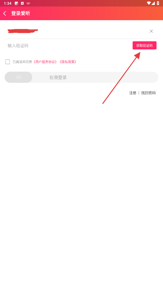 3、在登录的页面内,输入要登录的手机号,再点击获取验证码的按钮。