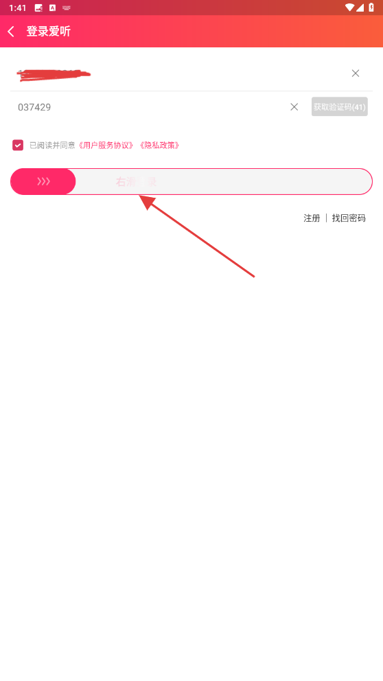4、将收到的验证码输入进去后,点击右滑登录的按钮。