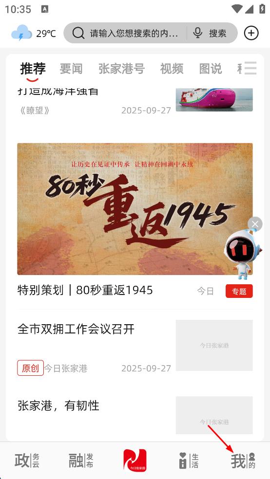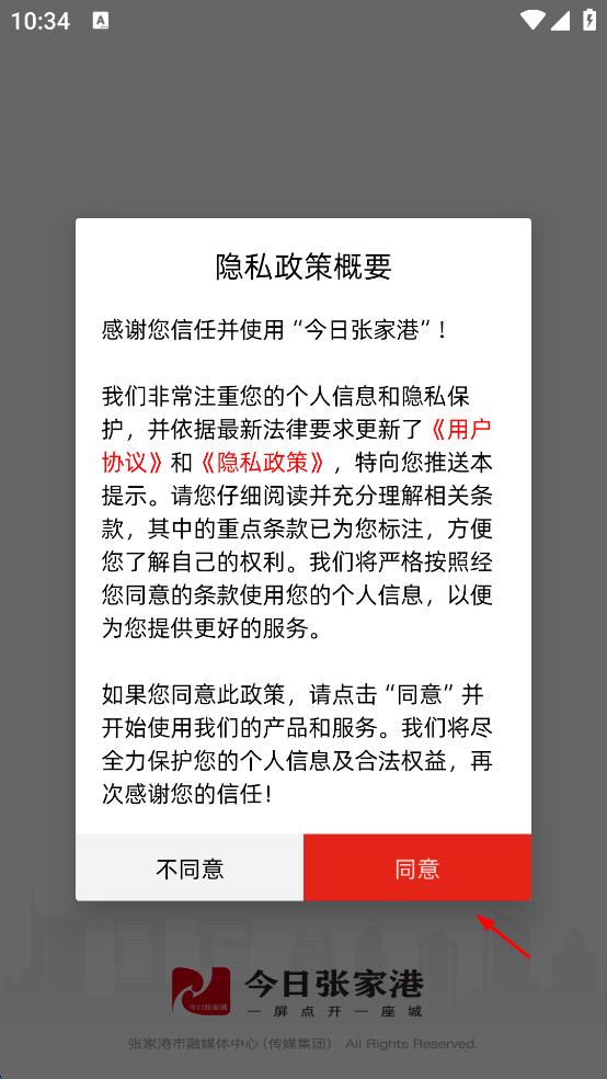 1、打开今日张家港,会出现隐私政策概要界面,仔细阅读后点击“同意”,进入软件主界面。