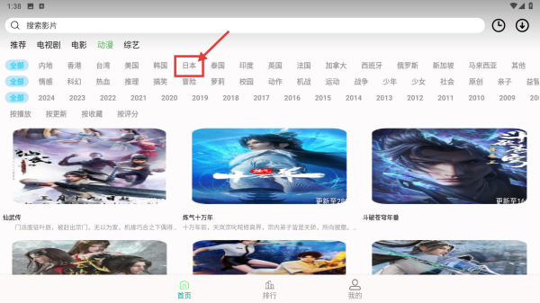 2、在动漫分类页面,点击日本区域选项,筛选出日本动漫列表。