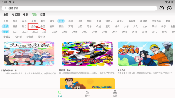 3、在日本动漫列表中,点击热血题材选项,筛选出热血类日本动漫。