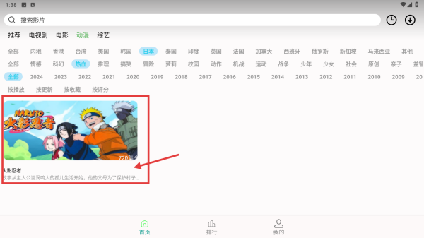 4、在热血类日本动漫列表中,找到目标动漫火影忍者,点击查看其详情。