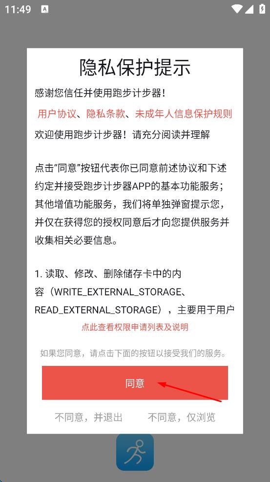 1、打开跑步计步器,会出现隐私保护提示界面,仔细阅读后点击“同意”,进入软件主界面。