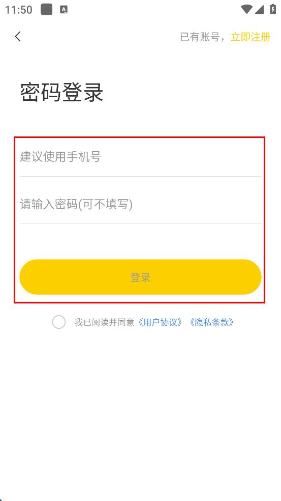 4、在密码登录页面,输入手机号,设置密码,勾选已阅读并同意用户协议和隐私条款后,点击“登录”完成登录。