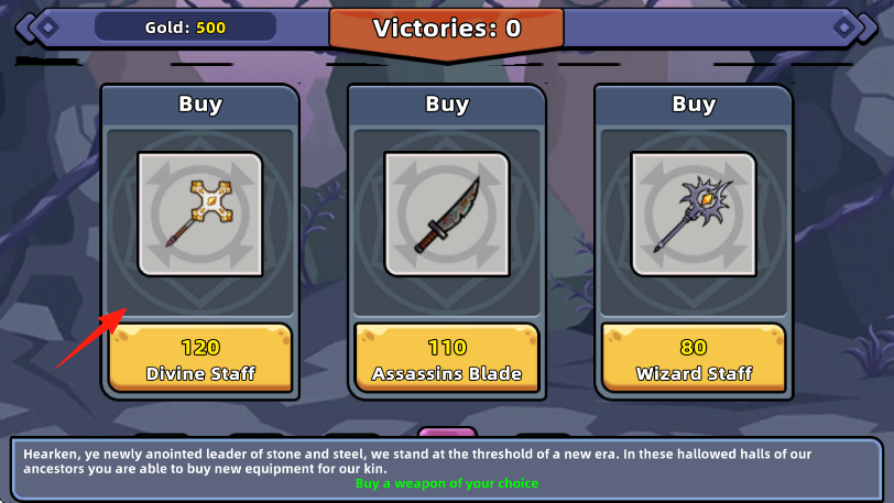 1、进入商店,用500金币,选“DivineStaff”(箭头指向),花费120金币购买,提升战力。