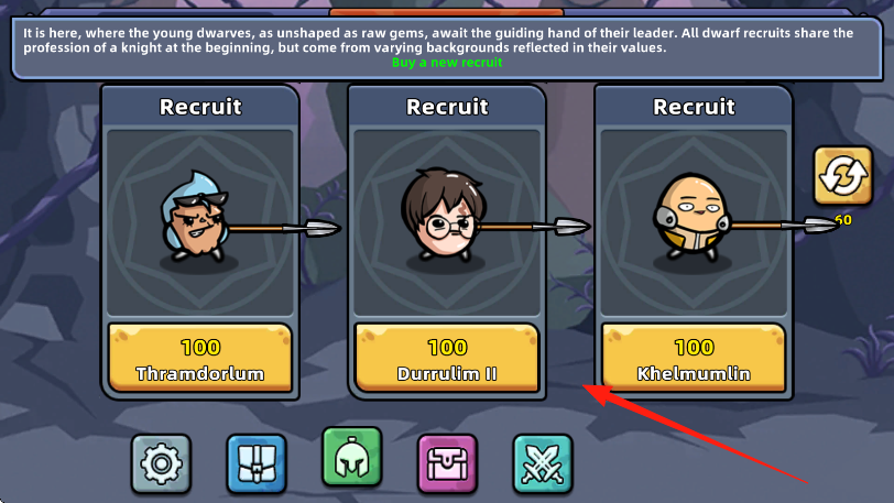 2、在招募界面,选“Khelmumlin”(箭头指向),花100金币招募,扩充队伍。