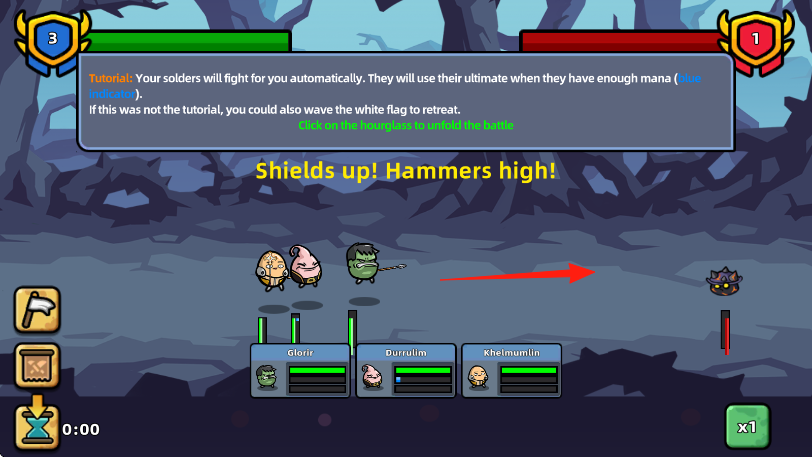 3、进入战场,带领矮人部队(含招募角色),沿箭头方向,自动攻击敌方怪物,推进关卡。