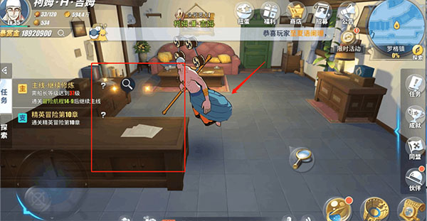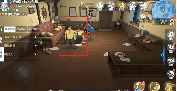 ①玩家在进入到【海上餐厅】的二楼的厨房时,当玩家走进时(如上图的位置)会在画面出现【放大镜】标识,玩家点击后就可以调查并且能获得【藏宝图碎片*2】的奖励。