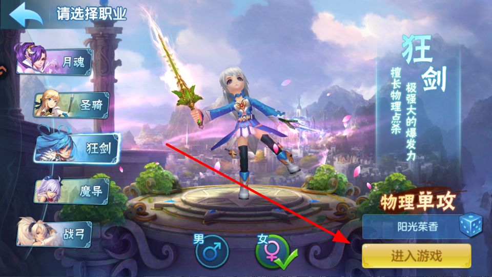 1、首先在职业选择界面,挑选喜欢的职业,像狂剑等,选好后点击进入游戏,开启在星辰奇缘的冒险之旅。