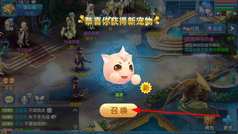 4、玩家当获得新宠物,点击召唤,可以将新宠物召唤出来,让宠物加入战斗等环节,助力自身在游戏中发展。