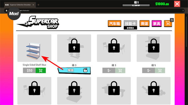 4、在家具界面,选择Single Sided Shelf Blue货架,花费$50购买,用于店铺商品陈列,优化店铺布局。