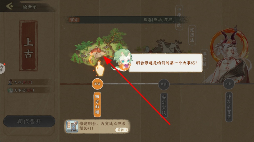 2、玩家接着会有一段剧情指引,比如修建明台等,跟随这些指引推进剧情,逐步了解游戏的背景与发展脉络。