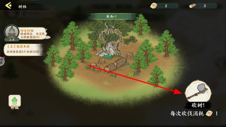 3、然后前往树林等场景,点击砍树等操作按钮,消耗相应道具获取木头等资源,这些资源可用于后续建设等环节。