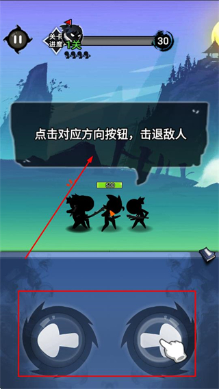 1、进入战斗界面,根据提示点击对应方向按钮,操控火柴人击退敌人,展开功夫对决。