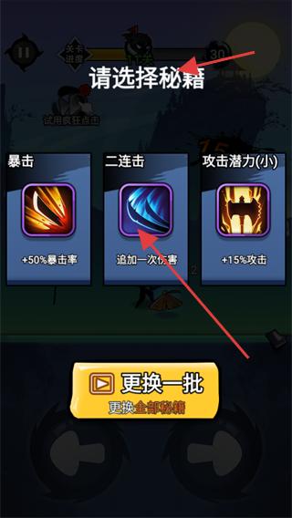 2、通过一关后,会出现秘籍选择界面,可从随机的三个秘籍中挑选,为后续战斗助力。