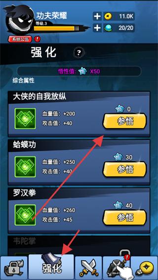 3、进入强化界面,能看到大侠的自我放、蛤蟆功等技能,点击参悟可提升技能的血量、攻击等属性,强化角色战力。