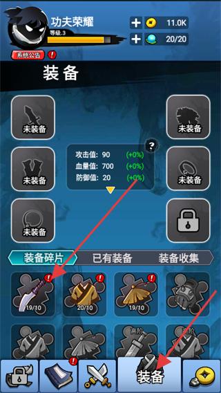 4、在装备界面,可查看装备碎片收集情况,收集足够碎片合成装备,提升角色的攻击、血量、防御等属性,增强整体战斗能力。